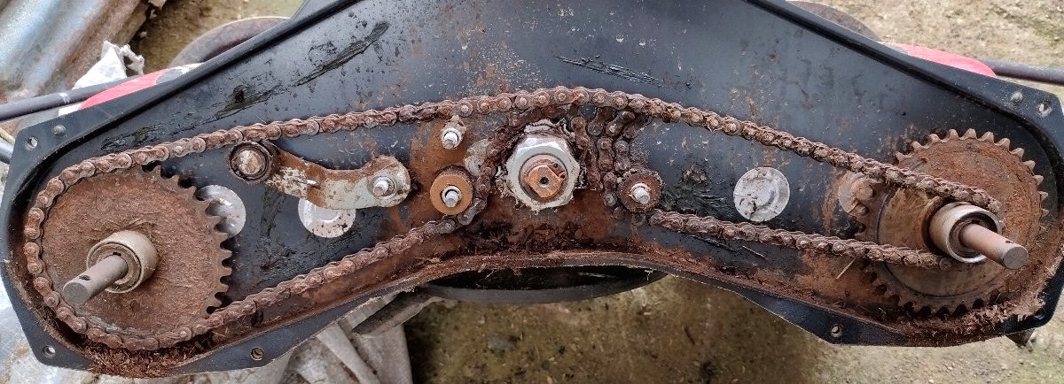 左側にあるテンションプーリーが外れてチェーンが緩んで絡まった