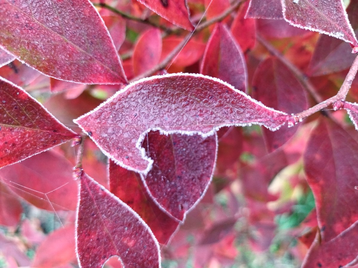 ブルーべリーの葉に霜が降りていた