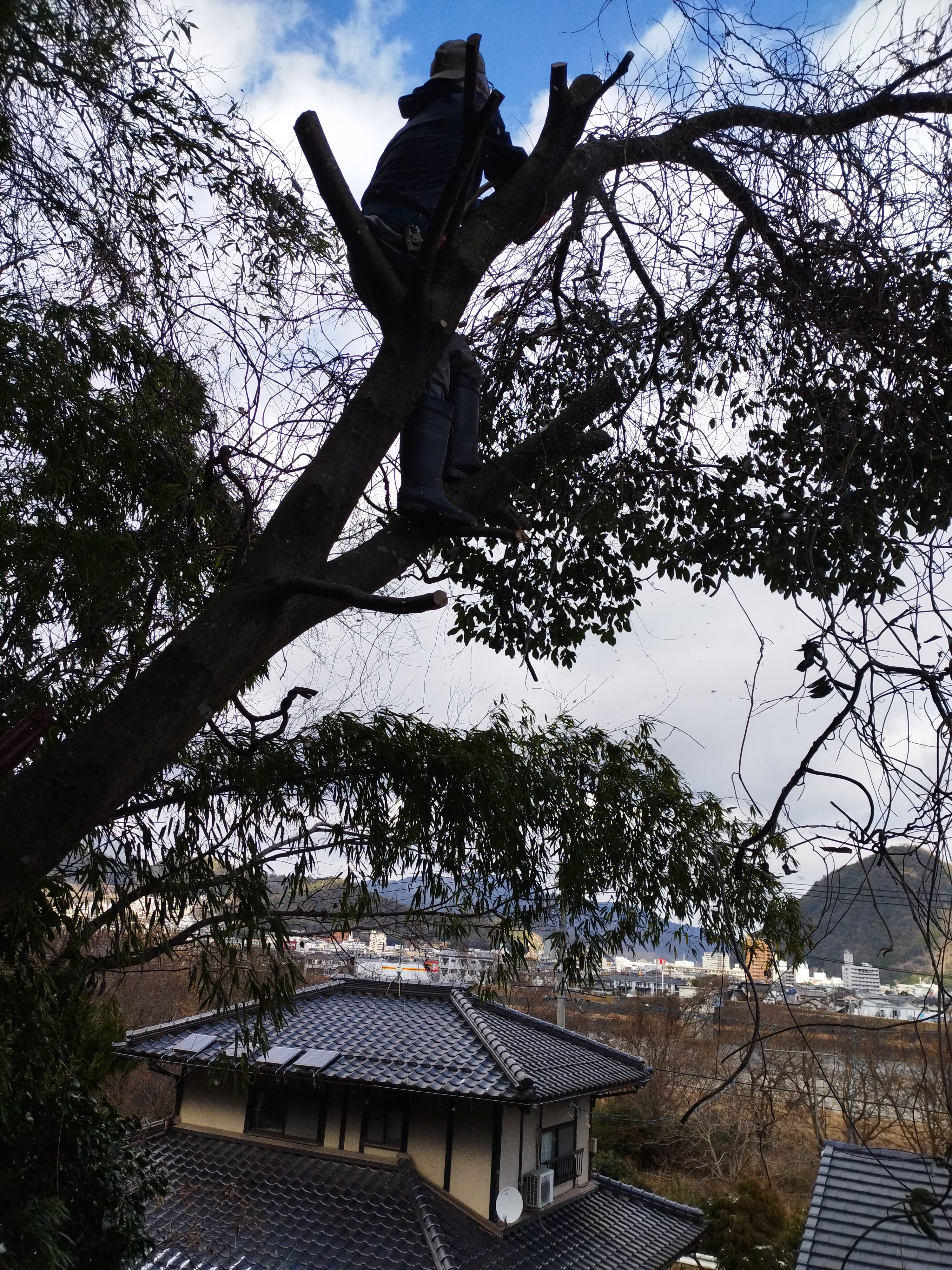 そのまま倒すと下の家に落ちそうなので枝を伐り降ろす