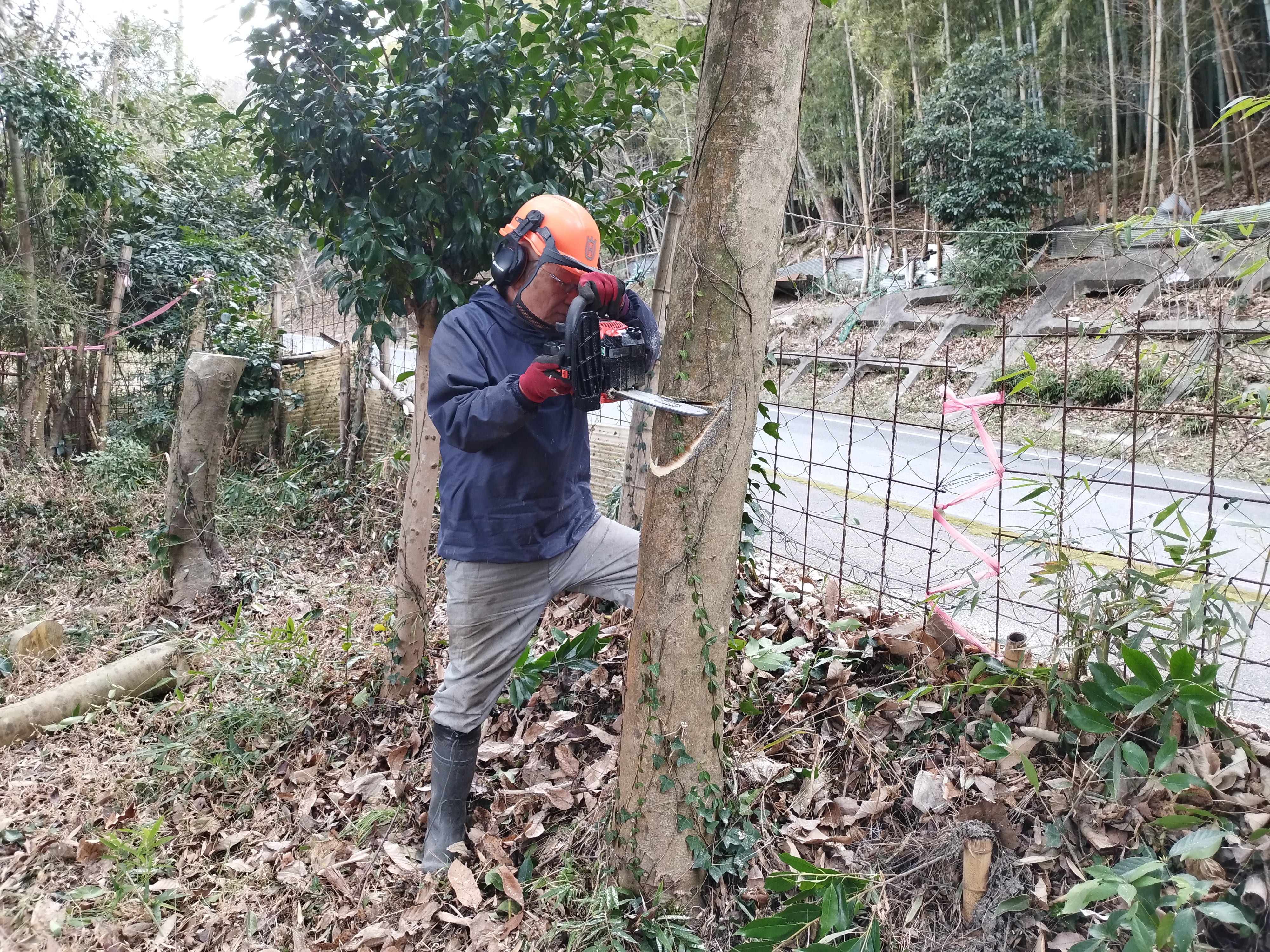 友人が樹形や伐倒方向によって色々な伐り方を試しているところ